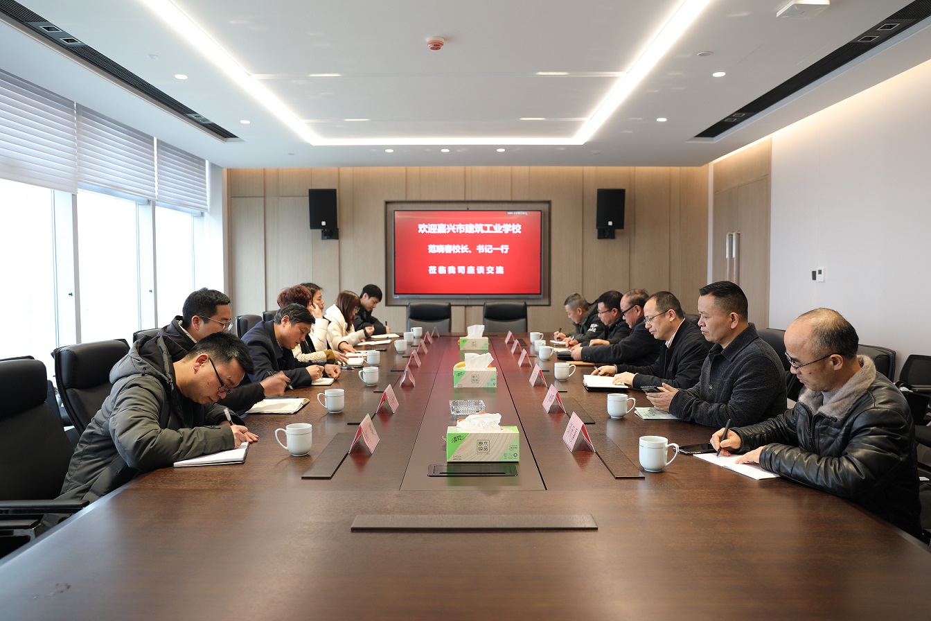 2022年2月23日,嘉兴市建筑工业学校党总支书记、校长范晓春一行来公司交流校企合作相关事项。公司党委书记、总裁徐建明和副总裁丁爱忠、潘利根及总工程师俞黎明等领导到会,并对建校领导的到来表示热烈欢迎。
